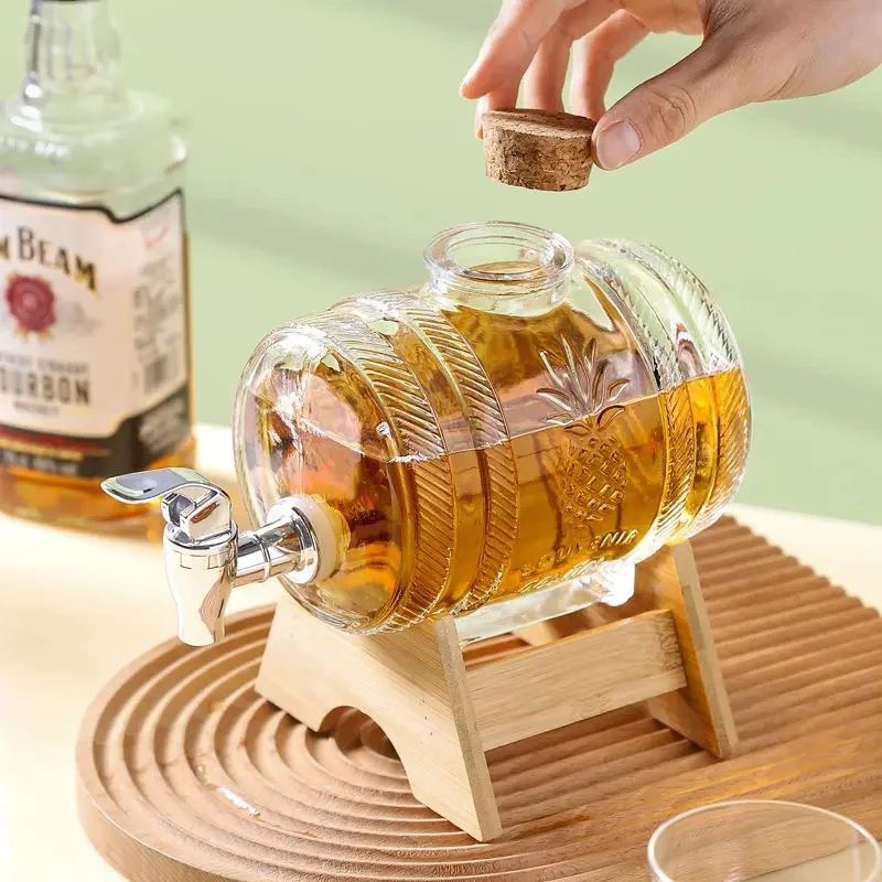 1L Glass Whiskey Barrel Wine Barrel Beer Bottle Fruit Aging Alcohol Honey Storage Container With Base Faucet Bar Set
